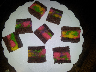 7. Bahagikan adunan kepada 6 bahagian. 2 bahagian campurkan serbuk koko dan coklat emulco. 4 bahagian lagi.....warnakan hijau (perasa pandan), pink (strawbery emulco), kuning (vanilla) dan purple (blueberry paste).